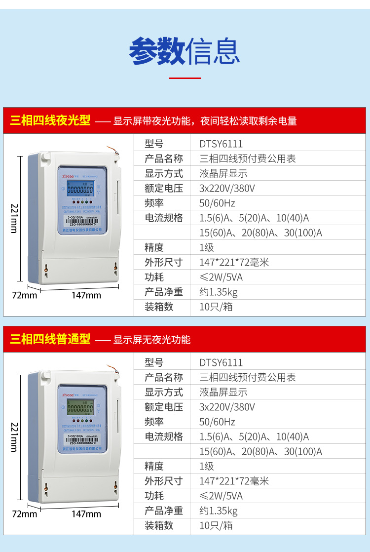 (四)三相預(yù)付費電度表(公用表)的參數(shù)信息:產(chǎn)品名稱、顯示方式、額定電流、頻率、電流規(guī)格、精度、外形尺寸、功耗、產(chǎn)品重量,裝箱數(shù)等信息,具體如下