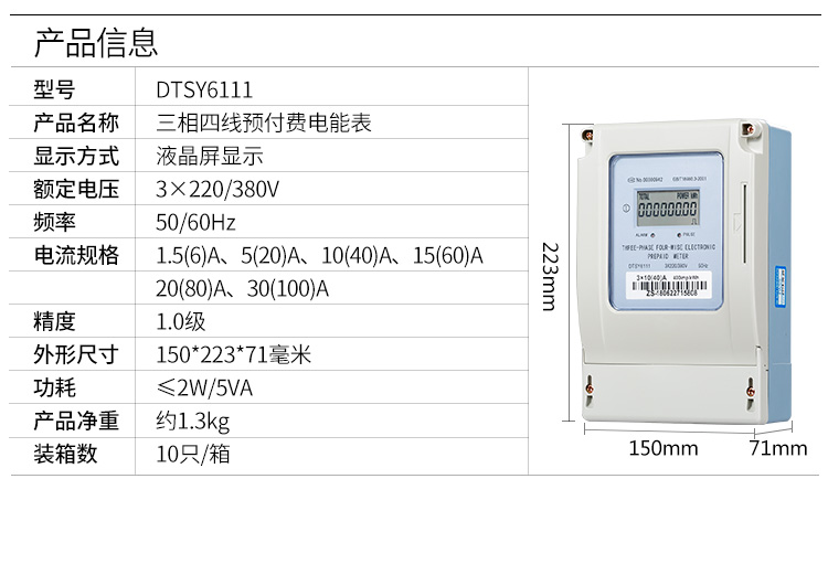 DTSY6111系列插卡式三相電子式預付費電能表系我公司采用集成電路,16位A/D轉換、數字乘法器、應用數字采樣處理技術并由先進的單片機處理系統進行數據的采集、處理和保存及應用SMT工藝制造的儀表。適用于計量額定頻率為50Hz或60Hz的三相三線或三相四線交流電網中有功電能的消耗。