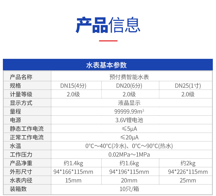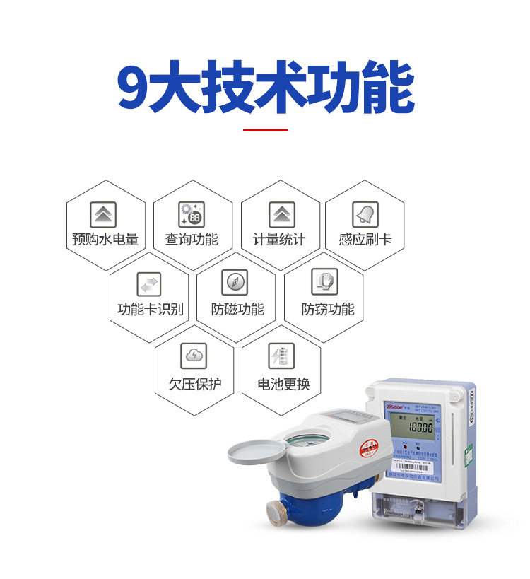 1、概述預付費水表是以旋翼式水表為基表,由干簧管取信裝置、低功耗電控閥門、微電腦控制系統(tǒng)、射頻卡信息系統(tǒng)集合而成的智能水表。該產(chǎn)品改變了傳統(tǒng)的用水收費方 式,由“先用水后交費”變?yōu)椤跋冉毁M后用水”, 每次售水收款都有記錄,解決了“收費難、賬目亂”這兩個水費管理工作中的難題。有遠傳抄表功能的預 付費水表還可實時統(tǒng)計用水數(shù)量,為水費結算提供依據(jù)。產(chǎn)品符合國家標準GB/T778-2007《封閉滿管道中水流量的測量、飲用冷水水表和熱水水表》的全部技術要求。