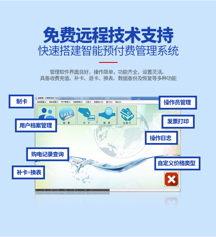 該管理軟件具備收費充值、補卡、退卡、換表、數(shù)據(jù)備份及恢復等多種功能。降低了物業(yè)管理成本,提高了工作效率,減小了勞動強度,水電費用提前收繳到位,而且?guī)つ繙蚀_、清晰。