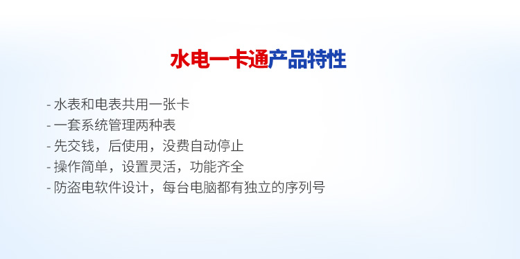 水電一卡通預付費管理系統(tǒng)由本公司生產(chǎn)的預付費電表、預付費水表、讀寫器和一卡通管理軟件構成,物業(yè)管理部門可通過本系統(tǒng)完成對水費、電費和天然氣費的智能化管理,無需挨家挨戶抄表收費,由用戶通過一張IC卡購水購電,先交費,后用水用電,解決了抄表累、收費難的問題,該系統(tǒng)是物業(yè)管理部門的好幫手, 該管理軟件界面良好,操作簡單方便,易學易用,功能齊全。
